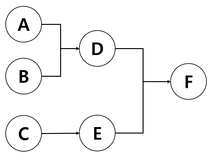 D, E공정이 끝나야 최종 F공정을 시작할 수 있다고 했을때