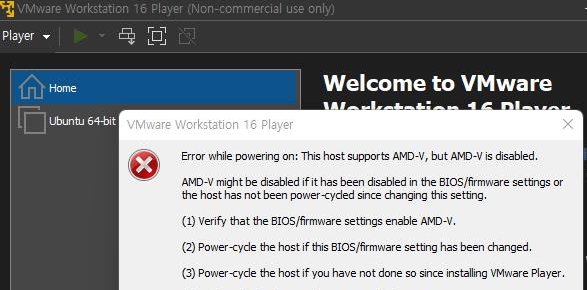 * 단, CPU의 가상화 기능이 꺼져있는 경우 아래처럼 실행이 안 될 수 있다. (이미 켜져있다면 상관없음)