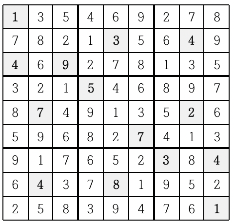위의 예의 경우, 첫째 줄에는 1을 제외한 나머지 2부터 9까지의 숫자들이 이미 나타나 있으므로 첫째 줄 빈칸에는 1이 들어가야 한다.