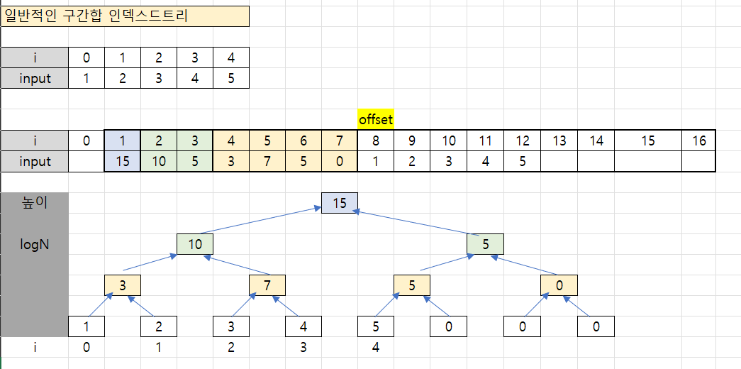 2로 나눠가면서 구간합을 미리 구해놓는 방식이다.