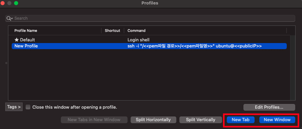 2. Profiles에서 방금 신규 생성한 Profile을 선택하고 새로운 터미널을 실행하면 접속 완료