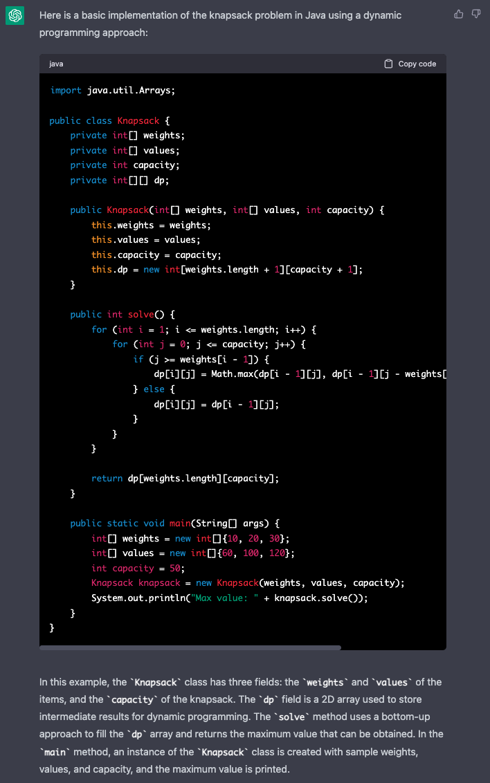 DP(Dynamic Programming)의 유명한 문제 중 하나인 배낭 문제의 java 코드를 달라고 했더니
