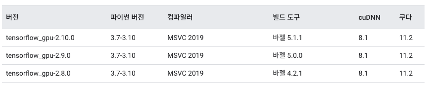 아래 표에 맞춰 tensorflow 2.10 - 쿠다 11.2 - cuDNN 8.1 으로 버전을 맞춰서 설치하니 문제가 해결됐다.