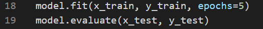 Line 19 : 이제 앞서 갖고 있는 test 검증 데이터로 만든 모델의 정확도를 평가해봅니다.
