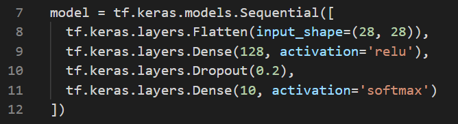 ① 먼저 model이라는 변수를 선언한 다음에 Sequential (순차적) 방식을 통해 모델을 만들어줍니다. 말그대로 순서대로 위에 있는 손으로 쓴 숫자의 Layer를 쌓겠다는 뜻