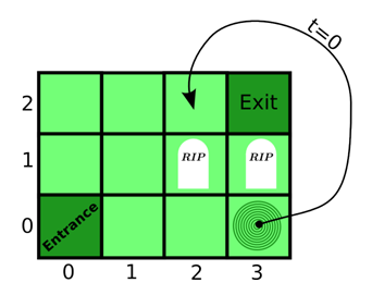묘지가 위와 같이 생긴 경우(문제의 두 번째 예제)를 살펴보자. 묘비는 (2,1)와 (3,1)에 있고, 귀신 구멍은 0초만에 (3,0)로 들어가서 (2,2)에서 나오는 구멍 하나가 있다. 묘지를 빠져나오는데 걸리는 가장 빠른 시간은 4초이며, 다음과 같다.